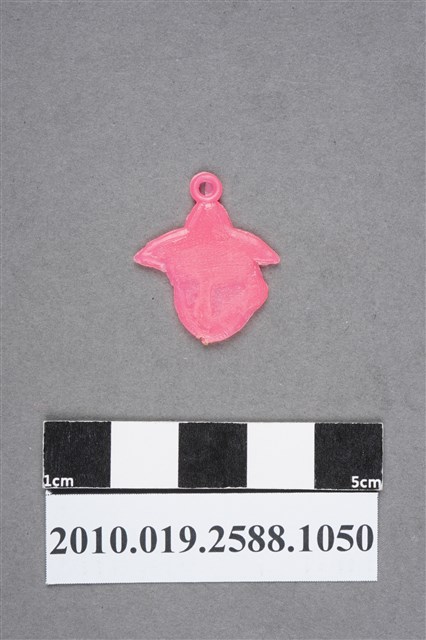 1.本物件為戴帽頭像尪仔仙。硬質塑膠材質,扁平,單一不透明粉紅色,單面浮雕圖案。正面圖案為男性頭像,頭上戴著帽子,帽頂呈尖形,帽型似斗笠,帽子底下可見頭髮。帽頂有小吊環。2.尪仔仙尺寸大致可分成小、中、大型,小型約長2-5公分,中型約長8-15公分,顏色以單色為主。有些大型的則可長達30公分左右,以菩薩、神仙和民間傳說故事人物等造型為主,塗上金銀紅黃彩漆等亮色。1960、70年代的尪仔仙多以民間傳說故事、歌仔戲、布袋戲人物為造型。1980年代改以卡通、電玩、漫畫人物造型為主。常見玩法之一為兩人(或多人)各持一只尪仔仙,輪流用手指彈射,看誰的尪仔仙先疊在對方上面,便可贏得對方用來對戰或是約定的尪仔仙。