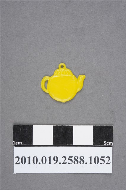 1.本物件為水壺尪仔仙。硬質塑膠材質,扁平,單一不透明黃色,雙面浮雕圖案,兩面圖案相同。圖案為圓身水壺,可見壺嘴和把手,壺蓋上有條紋。有小吊環。2.尪仔仙尺寸大致可分成小、中、大型,小型約長2-5公分,中型約長8-15公分,顏色以單色為主。有些大型的則可長達30公分左右,以菩薩、神仙和民間傳說故事人物等造型為主,塗上金銀紅黃彩漆等亮色。1960、70年代的尪仔仙多以民間傳說故事、歌仔戲、布袋戲人物為造型。1980年代改以卡通、電玩、漫畫人物造型為主。常見玩法之一為兩人(或多人)各持一只尪仔仙,輪流用手指彈射,看誰的尪仔仙先疊在對方上面,便可贏得對方用來對戰或是約定的尪仔仙。