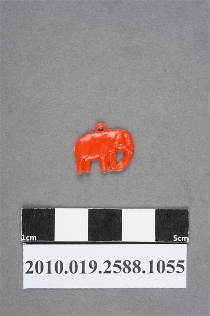 1.本物件為大象尪仔仙。硬質塑膠材質,扁平,單一不透明橘紅色,雙面浮雕圖案,兩面圖案相同。圖案為站立的大象,長鼻碰地,可見象耳和象牙。背上有小吊環。2.尪仔仙尺寸大致可分成小、中、大型,小型約長2-5公分,中型約長8-15公分,顏色以單色為主。有些大型的則可長達30公分左右,以菩薩、神仙和民間傳說故事人物等造型為主,塗上金銀紅黃彩漆等亮色。1960、70年代的尪仔仙多以民間傳說故事、歌仔戲、布袋戲人物為造型。1980年代改以卡通、電玩、漫畫人物造型為主。常見玩法之一為兩人(或多人)各持一只尪仔仙,輪流用手指彈射,看誰的尪仔仙先疊在對方上面,便可贏得對方用來對戰或是約定的尪仔仙。