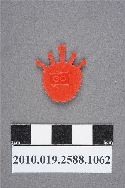1.本物件為怪物頭像尪仔仙。硬質塑膠材質,扁平,單一不透明橘紅色,單面浮雕圖案。正面圖案為頭頂有5根棒狀物的怪物頭像,呈放射狀發散,額頭上有3道被縫過的傷口。嘴巴部位為波浪狀條紋。頭頂有小吊環,背面有30之陽刻字樣,是系列尪仔仙。2.尪仔仙尺寸大致可分成小、中、大型,小型約長2-5公分,中型約長8-15公分,顏色以單色為主。有些大型的則可長達30公分左右,以菩薩、神仙和民間傳說故事人物等造型為主,塗上金銀紅黃彩漆等亮色。1960、70年代的尪仔仙多以民間傳說故事、歌仔戲、布袋戲人物為造型。1980年代改以卡通、電玩、漫畫人物造型為主。常見玩法之一為兩人(或多人)各持一只尪仔仙,輪流用手指彈射,看誰的尪仔仙先疊在對方上面,便可贏得對方用來對戰或是約定的尪仔仙。