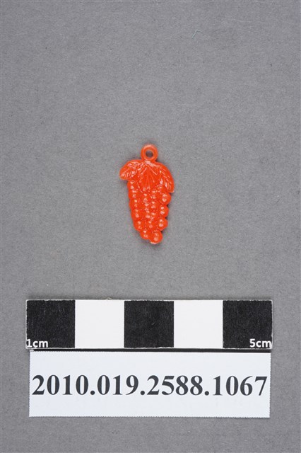1.本物件為葡萄尪仔仙。硬質塑膠材質,扁平,單一不透明橘紅色,雙面浮雕圖案,兩面圖案相同。圖案為1串葡萄,有3片葉子披在果實上,果實粒粒分明。有小吊環。2.尪仔仙尺寸大致可分成小、中、大型,小型約長2-5公分,中型約長8-15公分,顏色以單色為主。有些大型的則可長達30公分左右,以菩薩、神仙和民間傳說故事人物等造型為主,塗上金銀紅黃彩漆等亮色。1960、70年代的尪仔仙多以民間傳說故事、歌仔戲、布袋戲人物為造型。1980年代改以卡通、電玩、漫畫人物造型為主。常見玩法之一為兩人(或多人)各持一只尪仔仙,輪流用手指彈射,看誰的尪仔仙先疊在對方上面,便可贏得對方用來對戰或是約定的尪仔仙。