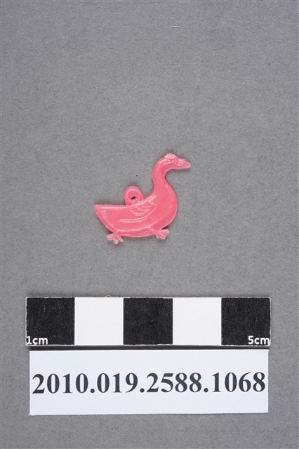 1.本物件為鵝尪仔仙。硬質塑膠材質,扁平,單一不透明粉紅色,雙面浮雕圖案,兩面圖案相同。圖案為鵝隻側面,頭頂有凸起,喙短尖,翅膀收在身旁,呈邁開雙腳走路貌。背上有小吊環。2.尪仔仙尺寸大致可分成小、中、大型,小型約長2-5公分,中型約長8-15公分,顏色以單色為主。有些大型的則可長達30公分左右,以菩薩、神仙和民間傳說故事人物等造型為主,塗上金銀紅黃彩漆等亮色。1960、70年代的尪仔仙多以民間傳說故事、歌仔戲、布袋戲人物為造型。1980年代改以卡通、電玩、漫畫人物造型為主。常見玩法之一為兩人(或多人)各持一只尪仔仙,輪流用手指彈射,看誰的尪仔仙先疊在對方上面,便可贏得對方用來對戰或是約定的尪仔仙。