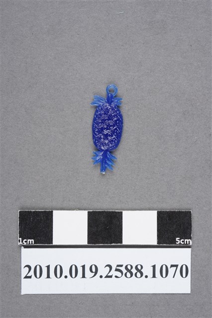 1.本物件為鳳梨尪仔仙。硬質塑膠材質,扁平,單一不透明藍色,雙面浮雕圖案。圖案為下方有果柄,上方有冠芽的鳳梨,可見表面呈菱格紋的果實。冠芽上有小吊環。2.尪仔仙尺寸大致可分成小、中、大型,小型約長2-5公分,中型約長8-15公分,顏色以單色為主。有些大型的則可長達30公分左右,以菩薩、神仙和民間傳說故事人物等造型為主,塗上金銀紅黃彩漆等亮色。1960、70年代的尪仔仙多以民間傳說故事、歌仔戲、布袋戲人物為造型。1980年代改以卡通、電玩、漫畫人物造型為主。常見玩法之一為兩人(或多人)各持一只尪仔仙,輪流用手指彈射,看誰的尪仔仙先疊在對方上面,便可贏得對方用來對戰或是約定的尪仔仙。