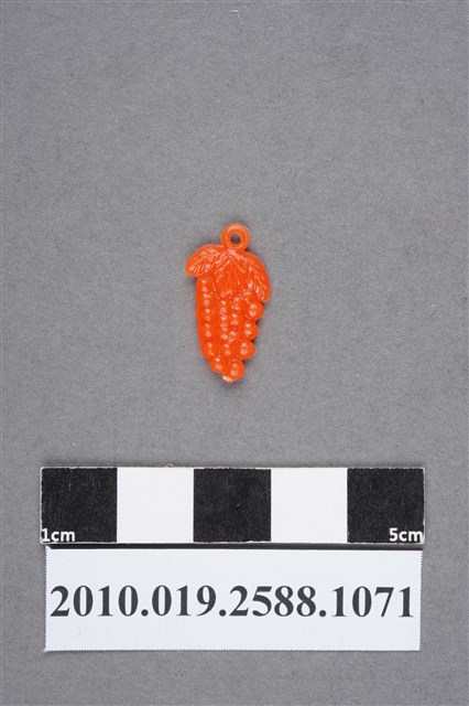 1.本物件為葡萄尪仔仙。硬質塑膠材質,扁平,單一不透明橘紅色,雙面浮雕圖案,兩面圖案相同。圖案為1串葡萄,有3片葉子披在果實上,果實粒粒分明。有小吊環。2.尪仔仙尺寸大致可分成小、中、大型,小型約長2-5公分,中型約長8-15公分,顏色以單色為主。有些大型的則可長達30公分左右,以菩薩、神仙和民間傳說故事人物等造型為主,塗上金銀紅黃彩漆等亮色。1960、70年代的尪仔仙多以民間傳說故事、歌仔戲、布袋戲人物為造型。1980年代改以卡通、電玩、漫畫人物造型為主。常見玩法之一為兩人(或多人)各持一只尪仔仙,輪流用手指彈射,看誰的尪仔仙先疊在對方上面,便可贏得對方用來對戰或是約定的尪仔仙。