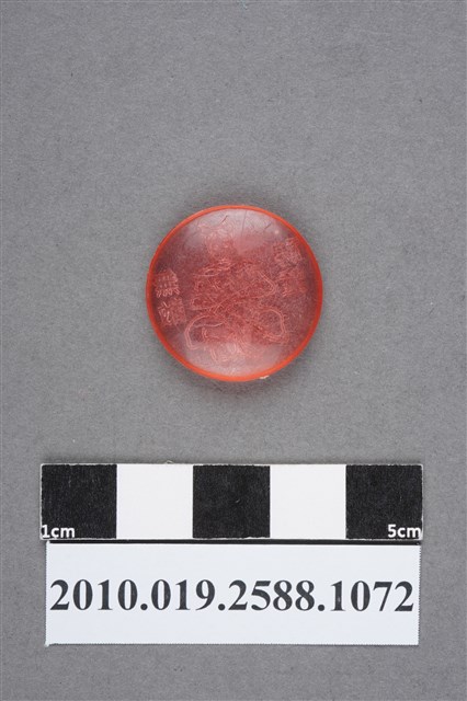 1.本物件為無敵神童尪仔仙。硬質塑膠材質,扁平,單一紅色,單面浮雕圖案。外觀呈圓形,正面圖案為盤腿坐的古代人型,頭上綁有雙髻,雙手合十在在胸前,人型旁邊有無敵神童字樣。