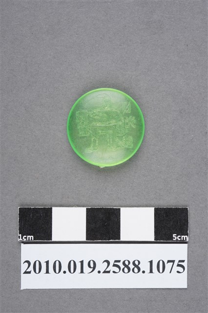 1.本物件為卡通霹靂日光號之同名尪仔仙。硬質塑膠材質,扁平,單一綠色,單面浮雕圖案。外觀呈圓形,正面圖案為左腳立起,右腳跪地的人型,右手彎曲放於胸前。人型旁邊有霹靂日光號字樣。