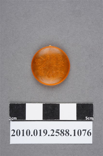 1.本物件為卡通霹靂日光號之同名尪仔仙。硬質塑膠材質,扁平,單一橙色,單面浮雕圖案。外觀呈圓形,正面圖案為左腳跪地,右腳立起的人型,右手拿著東西向上舉。人型旁邊有霹靂日光號字樣。