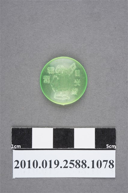 1.本物件為卡通霹靂日光號之同名尪仔仙。硬質塑膠材質,扁平,單一綠色,單面浮雕圖案。外觀呈圓形,正面圖案為站立男性人型,左手垂下,右手伸出食指往上舉,頭朝上望。人型旁邊有霹靂日光號字樣。