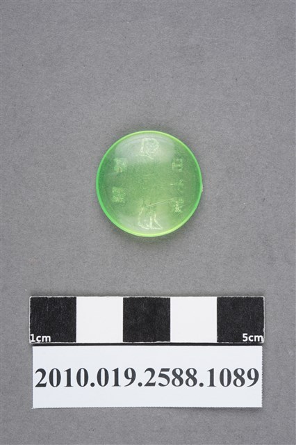 1.本物件為卡通霹靂日光號之同名尪仔仙。硬質塑膠材質,扁平,單一綠色,單面浮雕圖案。外觀呈圓形,正面圖案為站立全身人型,腳穿靴子,雙手下垂。人型旁邊有霹靂日光號字樣。