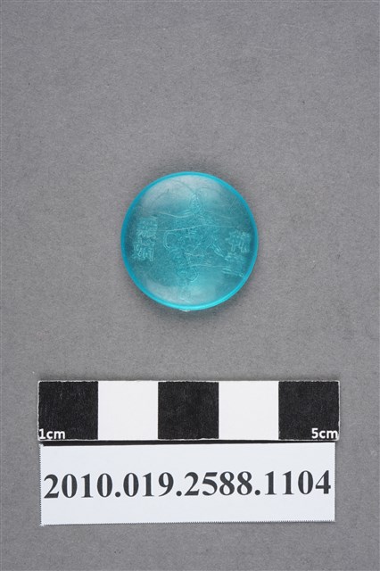 1.本物件為無敵神童尪仔仙。硬質塑膠材質,扁平,單一藍色,單面浮雕圖案。外觀呈圓形,正面圖案為站立的古代裝扮人型,頭上戴有裝飾物,左腳抬起,以右腳站立。人型旁邊有無敵神童字樣。