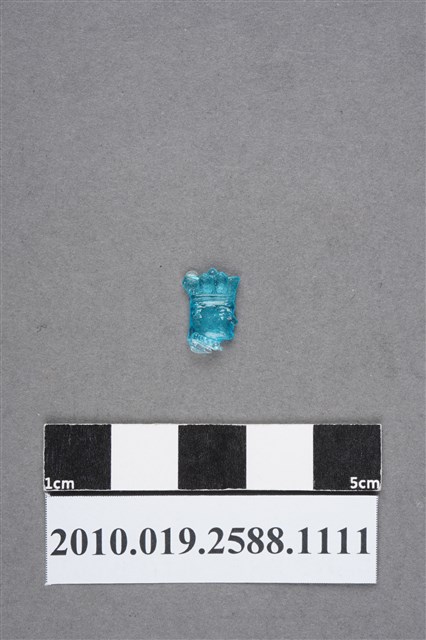 1.本物件為和尚頭像尪仔仙。硬質塑膠材質,扁平,單一藍色,雙面浮雕圖案。正面圖案為頭戴五佛冠和毘盧帽的和尚側面頭像,脖子上有佛珠。2.五佛冠又稱五方冠,如5瓣蓮花瓣連在一起,每瓣上有一龕一佛。戴五佛冠是要先戴上毘盧帽,再將五佛冠固定在毘盧帽外圍。3.尪仔仙尺寸大致可分成小、中、大型,小型約長2-5公分,中型約長8-15公分,顏色以單色為主。有些大型的則可長達30公分左右,以菩薩、神仙和民間傳說故事人物等造型為主,塗上金銀紅黃彩漆等亮色。1960、70年代的尪仔仙多以民間傳說故事、歌仔戲、布袋戲人物為造型。1980年代改以卡通、電玩、漫畫人物造型為主。常見玩法之一為兩人(或多人)各持一只尪仔仙,輪流用手指彈射,看誰的尪仔仙先疊在對方上面,便可贏得對方用來對戰或是約定的尪仔仙。