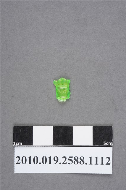 1.本物件為和尚頭像尪仔仙。硬質塑膠材質,扁平,單一綠色,雙面浮雕圖案。正面圖案為頭戴五佛冠和毘盧帽的和尚側面頭像,脖子上有佛珠。2.五佛冠又稱五方冠,如5瓣蓮花瓣連在一起,每瓣上有一龕一佛。戴五佛冠是要先戴上毘盧帽,再將五佛冠固定在毘盧帽外圍。3.尪仔仙尺寸大致可分成小、中、大型,小型約長2-5公分,中型約長8-15公分,顏色以單色為主。有些大型的則可長達30公分左右,以菩薩、神仙和民間傳說故事人物等造型為主,塗上金銀紅黃彩漆等亮色。1960、70年代的尪仔仙多以民間傳說故事、歌仔戲、布袋戲人物為造型。1980年代改以卡通、電玩、漫畫人物造型為主。常見玩法之一為兩人(或多人)各持一只尪仔仙,輪流用手指彈射,看誰的尪仔仙先疊在對方上面,便可贏得對方用來對戰或是約定的尪仔仙。