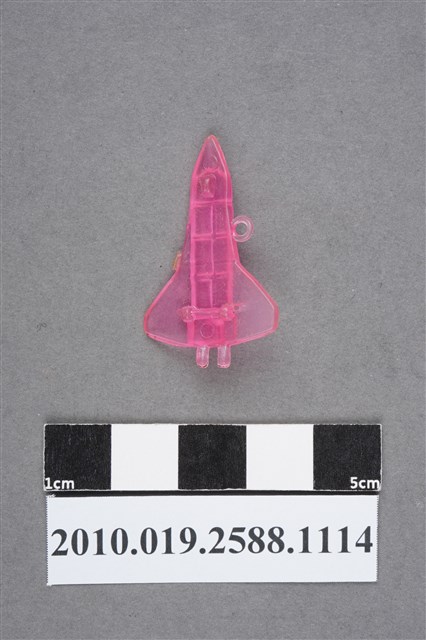 1.本物件為太空梭尪仔仙。硬質塑膠材質,扁平,單一桃紅色,雙面浮雕圖案。正面圖案為側翼靠近尾端的太空梭,機身無特殊裝飾,太空梭尾部有2個噴射口和垂直翼面,可見8格長方形構件。有小吊環。2.尪仔仙尺寸大致可分成小、中、大型,小型約長2-5公分,中型約長8-15公分,顏色以單色為主。有些大型的則可長達30公分左右,以菩薩、神仙和民間傳說故事人物等造型為主,塗上金銀紅黃彩漆等亮色。1960、70年代的尪仔仙多以民間傳說故事、歌仔戲、布袋戲人物為造型。1980年代改以卡通、電玩、漫畫人物造型為主。常見玩法之一為兩人(或多人)各持一只尪仔仙,輪流用手指彈射,看誰的尪仔仙先疊在對方上面,便可贏得對方用來對戰或是約定的尪仔仙。