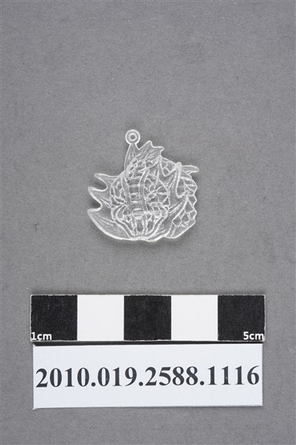 1.本物件為怪物頭像尪仔仙。硬質塑膠材質,扁平,單一透明無色,單面浮雕圖案。正面圖案為臉上有許多紋路,臉的兩側有火焰狀部位,髮型特殊。有小吊環,背面有10之陽刻字樣,是系列尪仔仙。2.尪仔仙尺寸大致可分成小、中、大型,小型約長2-5公分,中型約長8-15公分,顏色以單色為主。有些大型的則可長達30公分左右,以菩薩、神仙和民間傳說故事人物等造型為主,塗上金銀紅黃彩漆等亮色。1960、70年代的尪仔仙多以民間傳說故事、歌仔戲、布袋戲人物為造型。1980年代改以卡通、電玩、漫畫人物造型為主。常見玩法之一為兩人(或多人)各持一只尪仔仙,輪流用手指彈射,看誰的尪仔仙先疊在對方上面,便可贏得對方用來對戰或是約定的尪仔仙。