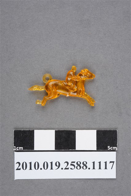 1.本物件為騎馬人型尪仔仙。硬質塑膠材質,扁平,單一橙色,雙面浮雕圖案,兩面圖案相同。圖案為騎在馬背上的人型,騎士坐在馬鞍上,手握韁繩,馬匹呈奔跑姿勢,尾巴揚起。馬臀上有小吊環。2.尪仔仙尺寸大致可分成小、中、大型,小型約長2-5公分,中型約長8-15公分,顏色以單色為主。有些大型的則可長達30公分左右,以菩薩、神仙和民間傳說故事人物等造型為主,塗上金銀紅黃彩漆等亮色。1960、70年代的尪仔仙多以民間傳說故事、歌仔戲、布袋戲人物為造型。1980年代改以卡通、電玩、漫畫人物造型為主。常見玩法之一為兩人(或多人)各持一只尪仔仙,輪流用手指彈射,看誰的尪仔仙先疊在對方上面,便可贏得對方用來對戰或是約定的尪仔仙。