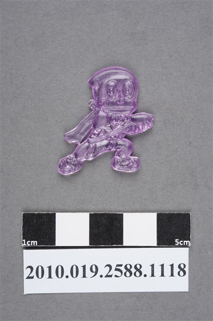 1.本物件為卡通忍者哈特利(忍者小叮噹)之哈特利尪仔仙。硬質塑膠材質,扁平,單一紫色,雙面浮雕圖案,兩面圖案相同。圖案為臉頰上的螺旋形酒窩的哈特利準備戰鬥的樣子,頭上戴有頭巾,身穿忍者服,鞋子樣式為夾腳,一手反手拿著劍,一腳伸直,一腳彎曲。