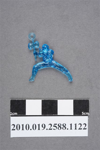 1.本物件為持斧人型尪仔仙。硬質塑膠材質,扁平,單一藍色,雙面浮雕圖案。正面圖案為右手持著雙頭斧的站立男性人型,光頭和有絡腮鬍,雙腳往左右張開,膝蓋略有彎曲。雙頭斧柄頂上有小吊環。2.尪仔仙尺寸大致可分成小、中、大型,小型約長2-5公分,中型約長8-15公分,顏色以單色為主。有些大型的則可長達30公分左右,以菩薩、神仙和民間傳說故事人物等造型為主,塗上金銀紅黃彩漆等亮色。1960、70年代的尪仔仙多以民間傳說故事、歌仔戲、布袋戲人物為造型。1980年代改以卡通、電玩、漫畫人物造型為主。常見玩法之一為兩人(或多人)各持一只尪仔仙,輪流用手指彈射,看誰的尪仔仙先疊在對方上面,便可贏得對方用來對戰或是約定的尪仔仙。