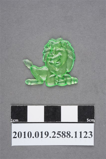 1.本物件為獅子尪仔仙。硬質塑膠材質,扁平,單一綠色,雙面浮雕圖案,兩面圖案相同。圖案為趴在地上的獅子,獅嘴張開,臀部微翹,尾巴立起來。2.尪仔仙尺寸大致可分成小、中、大型,小型約長2-5公分,中型約長8-15公分,顏色以單色為主。有些大型的則可長達30公分左右,以菩薩、神仙和民間傳說故事人物等造型為主,塗上金銀紅黃彩漆等亮色。1960、70年代的尪仔仙多以民間傳說故事、歌仔戲、布袋戲人物為造型。1980年代改以卡通、電玩、漫畫人物造型為主。常見玩法之一為兩人(或多人)各持一只尪仔仙,輪流用手指彈射,看誰的尪仔仙先疊在對方上面,便可贏得對方用來對戰或是約定的尪仔仙。