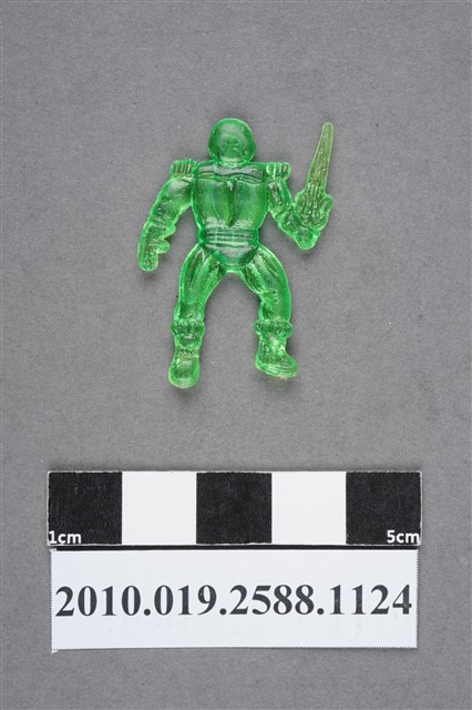 1.本物件為持劍人型尪仔仙。硬質塑膠材質,扁平,單一綠色,雙面浮雕圖案。正面圖案為戴有圓型頭罩的人型,裝扮是肩膀有凸出裝飾,繫有腰帶,腳穿靴子,另可見大腿肌肉線條,右手拿有劍型武器。2.尪仔仙尺寸大致可分成小、中、大型,小型約長2-5公分,中型約長8-15公分,顏色以單色為主。有些大型的則可長達30公分左右,以菩薩、神仙和民間傳說故事人物等造型為主,塗上金銀紅黃彩漆等亮色。1960、70年代的尪仔仙多以民間傳說故事、歌仔戲、布袋戲人物為造型。1980年代改以卡通、電玩、漫畫人物造型為主。常見玩法之一為兩人(或多人)各持一只尪仔仙,輪流用手指彈射,看誰的尪仔仙先疊在對方上面,便可贏得對方用來對戰或是約定的尪仔仙。