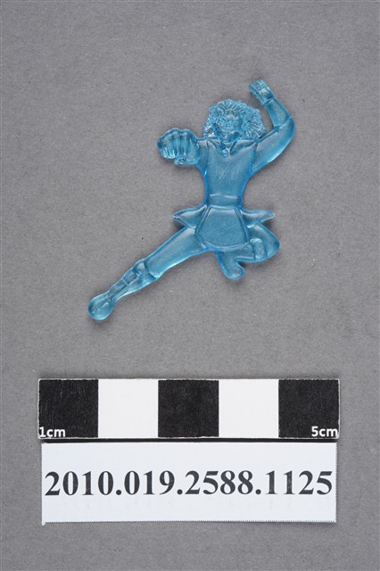 1.本物件為功夫人型尪仔仙。硬質塑膠材質,扁平,單一藍色,雙面浮雕圖案,兩面圖案相同。圖案為擺出功夫姿勢的人型,頭髮蓬鬆,臉上戴有半截面罩,一手往上舉,一手握拳往前擊,一腳呈蹲姿,另一腳伸直。2.尪仔仙尺寸大致可分成小、中、大型,小型約長2-5公分,中型約長8-15公分,顏色以單色為主。有些大型的則可長達30公分左右,以菩薩、神仙和民間傳說故事人物等造型為主,塗上金銀紅黃彩漆等亮色。1960、70年代的尪仔仙多以民間傳說故事、歌仔戲、布袋戲人物為造型。1980年代改以卡通、電玩、漫畫人物造型為主。常見玩法之一為兩人(或多人)各持一只尪仔仙,輪流用手指彈射,看誰的尪仔仙先疊在對方上面,便可贏得對方用來對戰或是約定的尪仔仙。