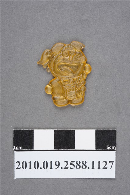 1.本物件為卡通哆啦A夢(小叮噹)之哆啦A夢尪仔仙。硬質塑膠材質,扁平,單一黃色,雙面浮雕圖案,兩面圖案相同。圖案為打扮成日本武士的哆啦A夢,綁有頭帶,頭帶中間有圖案,額頭前有2片瀏海,後腦杓綁1撮頭髮,張嘴笑,腰間插有1把刀,其右手往上舉。