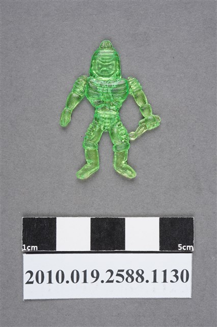 1.本物件為頭盔人型尪仔仙。硬質塑膠材質,扁平,單一綠色,雙面浮雕圖案。正面圖案為站立人型,其頭部戴著面具型頭盔,身上穿著特殊服裝,右手拿著有球狀物構造的物品。2.尪仔仙尺寸大致可分成小、中、大型,小型約長2-5公分,中型約長8-15公分,顏色以單色為主。有些大型的則可長達30公分左右,以菩薩、神仙和民間傳說故事人物等造型為主,塗上金銀紅黃彩漆等亮色。1960、70年代的尪仔仙多以民間傳說故事、歌仔戲、布袋戲人物為造型。1980年代改以卡通、電玩、漫畫人物造型為主。常見玩法之一為兩人(或多人)各持一只尪仔仙,輪流用手指彈射,看誰的尪仔仙先疊在對方上面,便可贏得對方用來對戰或是約定的尪仔仙。