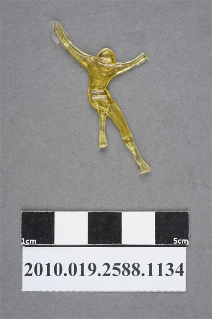 1.本物件為雙手高舉人型尪仔仙。硬質塑膠材質,扁平,單一黃色,內嵌金粉,雙面浮雕圖案,兩面圖案相同。圖案為戴有頭盔之人型,無法辨識服裝類型,雙手向上舉,一腳伸直,另一腳彎曲,呈從上往下跳之姿勢。左手略短。2.尪仔仙尺寸大致可分成小、中、大型,小型約長2-5公分,中型約長8-15公分,顏色以單色為主。有些大型的則可長達30公分左右,以菩薩、神仙和民間傳說故事人物等造型為主,塗上金銀紅黃彩漆等亮色。1960、70年代的尪仔仙多以民間傳說故事、歌仔戲、布袋戲人物為造型。1980年代改以卡通、電玩、漫畫人物造型為主。常見玩法之一為兩人(或多人)各持一只尪仔仙,輪流用手指彈射,看誰的尪仔仙先疊在對方上面,便可贏得對方用來對戰或是約定的尪仔仙。