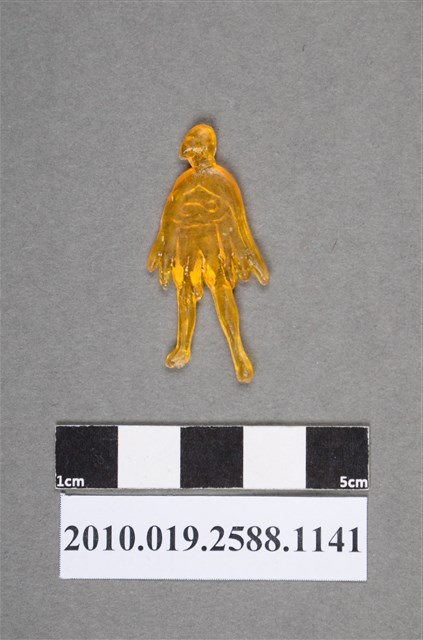 1.本物件為卡通科學小飛俠之鐵雄尪仔仙。硬質塑膠材質,扁平,單一黃色,雙面浮雕圖案。正面圖案為站立的鐵雄,戴著頭盔,繫有腰帶,身穿鳥羽狀披風,雙手交叉抱胸。