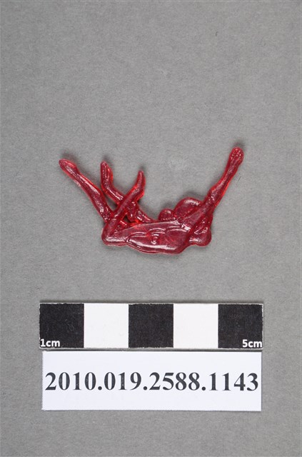 1.本物件為紅色人型尪仔仙。硬質塑膠材質,扁平,單一紅色,雙面浮雕圖案。正面圖案為從上而降的人型,嘴巴張開,身體呈水平,其手腳皆往背後彎,戴有造型眼鏡。2.尪仔仙尺寸大致可分成小、中、大型,小型約長2-5公分,中型約長8-15公分,顏色以單色為主。有些大型的則可長達30公分左右,以菩薩、神仙和民間傳說故事人物等造型為主,塗上金銀紅黃彩漆等亮色。1960、70年代的尪仔仙多以民間傳說故事、歌仔戲、布袋戲人物為造型。1980年代改以卡通、電玩、漫畫人物造型為主。常見玩法之一為兩人(或多人)各持一只尪仔仙,輪流用手指彈射,看誰的尪仔仙先疊在對方上面,便可贏得對方用來對戰或是約定的尪仔仙。