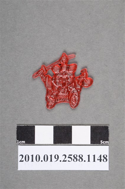 1.本物件為卡通桃太郎傳說之桃太郎尪仔仙。硬質塑膠材質,扁平,單一紅色,雙面浮雕圖案,兩面圖案相同。圖案為跑步的桃太郎,兩邊頭髮往後飛揚,額頭綁有頭帶,正中間有桃子圖案。打扮為日本武士風格,一手舉著劍,一手抓著1袋物品。