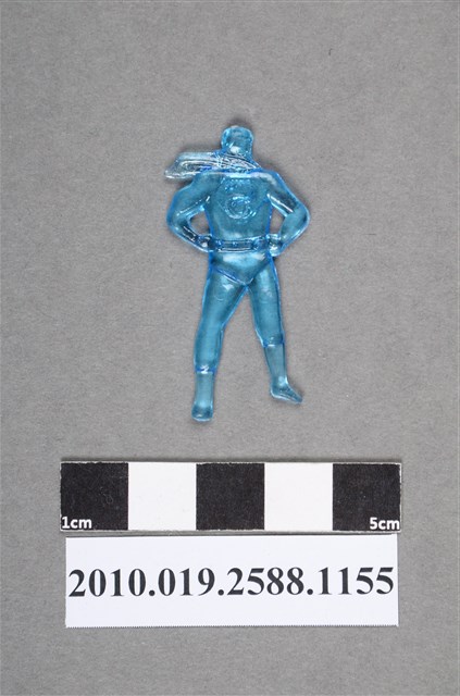 1.本物件為超人尪仔仙。硬質塑膠材質,扁平,單一藍色,雙面浮雕圖案。正面圖案為超人穿著披風和超人裝,胸前有S字,披風揚起,繫有腰帶,肩膀肌肉明顯,雙手插腰。
