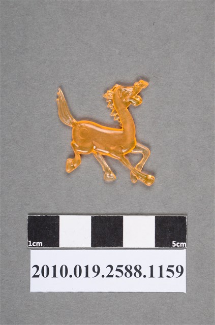 1.本物件為橘色驢型尪仔仙。硬質塑膠材質,扁平,單一橘色,雙面浮雕圖案,兩面圖案相同。圖案為站立的驢型動物,表情呈現快樂貌,嘴巴張開。頭部和頸部有鬃毛,尾巴往上翹,有蹄。2.尪仔仙尺寸大致可分成小、中、大型,小型約長2-5公分,中型約長8-15公分,顏色以單色為主。有些大型的則可長達30公分左右,以菩薩、神仙和民間傳說故事人物等造型為主,塗上金銀紅黃彩漆等亮色。1960、70年代的尪仔仙多以民間傳說故事、歌仔戲、布袋戲人物為造型。1980年代改以卡通、電玩、漫畫人物造型為主。常見玩法之一為兩人(或多人)各持一只尪仔仙,輪流用手指彈射,看誰的尪仔仙先疊在對方上面,便可贏得對方用來對戰或是約定的尪仔仙。
