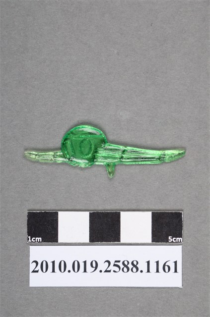 1.本物件為綠色尪仔仙。硬質塑膠材質,扁平,單一綠色,雙面浮雕圖案。無法辨識圖案類型,由圓形和2個尖狀構件組合而成主體,較大的尖狀下方有凸出物。2.尪仔仙尺寸大致可分成小、中、大型,小型約長2-5公分,中型約長8-15公分,顏色以單色為主。有些大型的則可長達30公分左右,以菩薩、神仙和民間傳說故事人物等造型為主,塗上金銀紅黃彩漆等亮色。1960、70年代的尪仔仙多以民間傳說故事、歌仔戲、布袋戲人物為造型。1980年代改以卡通、電玩、漫畫人物造型為主。常見玩法之一為兩人(或多人)各持一只尪仔仙,輪流用手指彈射,看誰的尪仔仙先疊在對方上面,便可贏得對方用來對戰或是約定的尪仔仙。