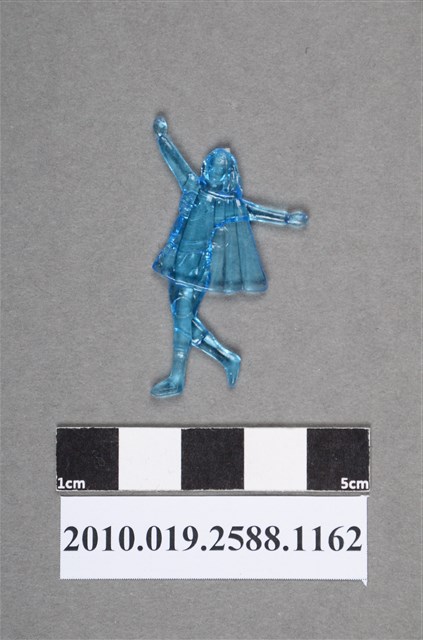 1.本物件為披風人型尪仔仙。硬質塑膠材質,扁平,單一藍色,雙面浮雕圖案。正面圖案為站立人型,為女超人之形象,穿有披風和短裙,胸前有S字,頭略往上仰,左手往斜上方伸,右手往旁邊伸,左腳往後彎曲,右腳著地。2.尪仔仙尺寸大致可分成小、中、大型,小型約長2-5公分,中型約長8-15公分,顏色以單色為主。有些大型的則可長達30公分左右,以菩薩、神仙和民間傳說故事人物等造型為主,塗上金銀紅黃彩漆等亮色。1960、70年代的尪仔仙多以民間傳說故事、歌仔戲、布袋戲人物為造型。1980年代改以卡通、電玩、漫畫人物造型為主。常見玩法之一為兩人(或多人)各持一只尪仔仙,輪流用手指彈射,看誰的尪仔仙先疊在對方上面,便可贏得對方用來對戰或是約定的尪仔仙。