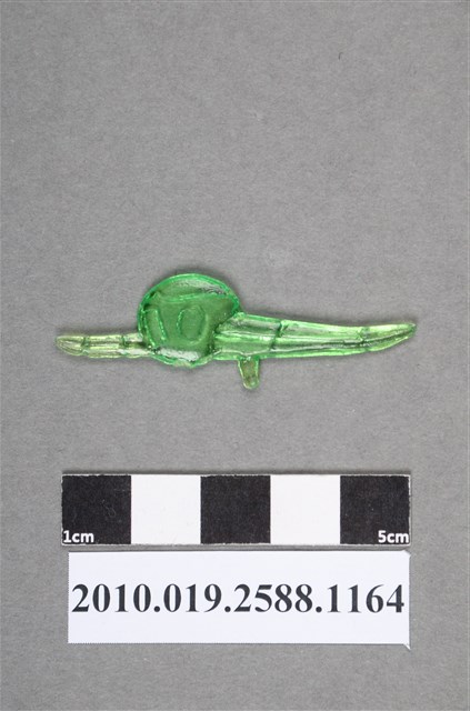 1.本物件為綠色尪仔仙。硬質塑膠材質,扁平,單一綠色,雙面浮雕圖案。無法辨識圖案類型,由圓形和2個尖狀構件組合而成主體,較大的尖狀下方有凸出物。2.尪仔仙尺寸大致可分成小、中、大型,小型約長2-5公分,中型約長8-15公分,顏色以單色為主。有些大型的則可長達30公分左右,以菩薩、神仙和民間傳說故事人物等造型為主,塗上金銀紅黃彩漆等亮色。1960、70年代的尪仔仙多以民間傳說故事、歌仔戲、布袋戲人物為造型。1980年代改以卡通、電玩、漫畫人物造型為主。常見玩法之一為兩人(或多人)各持一只尪仔仙,輪流用手指彈射,看誰的尪仔仙先疊在對方上面,便可贏得對方用來對戰或是約定的尪仔仙。