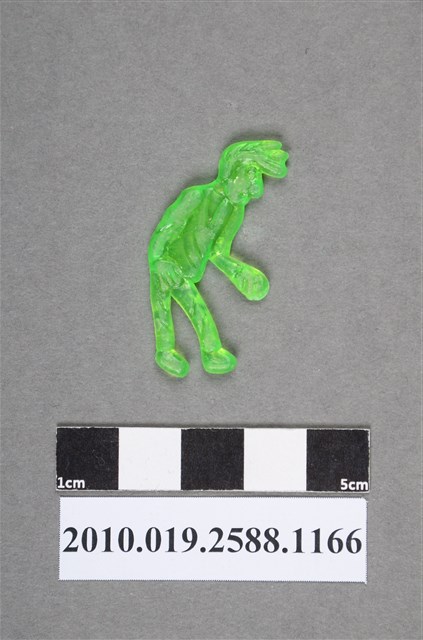 1.本物件為綠色人型尪仔仙。硬質塑膠材質,扁平,單一綠色,雙面浮雕圖案。正面圖案為側面的彎腰站立男性人型,額頭上的頭髮往前凸出,鼻子比例大,雙手微彎。2.尪仔仙尺寸大致可分成小、中、大型,小型約長2-5公分,中型約長8-15公分,顏色以單色為主。有些大型的則可長達30公分左右,以菩薩、神仙和民間傳說故事人物等造型為主,塗上金銀紅黃彩漆等亮色。1960、70年代的尪仔仙多以民間傳說故事、歌仔戲、布袋戲人物為造型。1980年代改以卡通、電玩、漫畫人物造型為主。常見玩法之一為兩人(或多人)各持一只尪仔仙,輪流用手指彈射,看誰的尪仔仙先疊在對方上面,便可贏得對方用來對戰或是約定的尪仔仙。