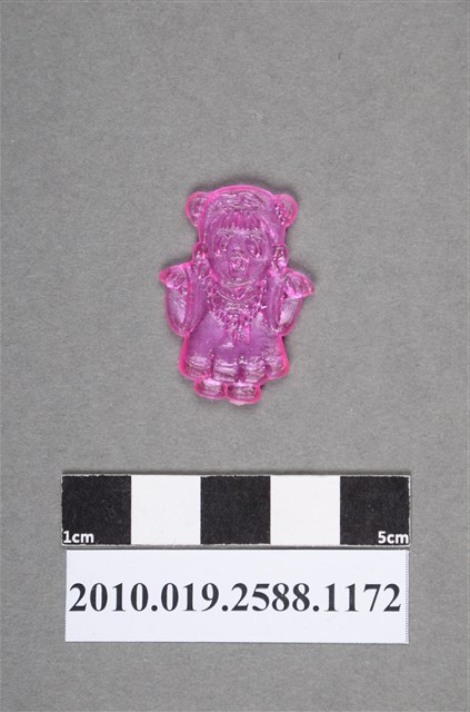 1.本物件為殭屍尪仔仙。硬質塑膠材質,扁平,單一桃紅色,雙面浮雕圖案,兩面圖案相同。圖案為Q版女性殭屍,因有橢圓形黑眼圈。其頭上綁有2個髮髻,有瀏海,身穿古代裙裝,裙子有摺,胸前戴有1串長珠子。雙手平舉,袖子垂下。2.尪仔仙尺寸大致可分成小、中、大型,小型約長2-5公分,中型約長8-15公分,顏色以單色為主。有些大型的則可長達30公分左右,以菩薩、神仙和民間傳說故事人物等造型為主,塗上金銀紅黃彩漆等亮色。1960、70年代的尪仔仙多以民間傳說故事、歌仔戲、布袋戲人物為造型。1980年代改以卡通、電玩、漫畫人物造型為主。常見玩法之一為兩人(或多人)各持一只尪仔仙,輪流用手指彈射,看誰的尪仔仙先疊在對方上面,便可贏得對方用來對戰或是約定的尪仔仙。
