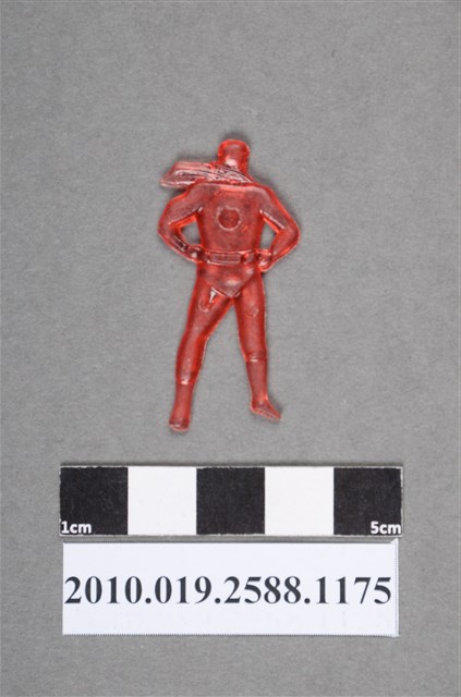 1.本物件為超人尪仔仙。硬質塑膠材質,扁平,單一紅色,雙面浮雕圖案。正面圖案為超人穿著披風和超人裝,胸前有S字,披風揚起,繫有腰帶,肩膀肌肉明顯,雙手插腰。