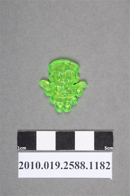 1.本物件為殭屍尪仔仙。硬質塑膠材質,扁平,單一綠色,雙面浮雕圖案,兩面圖案相同。圖案為Q版殭屍,因有橢圓形黑眼圈,為男孩形象。其嘴巴張開,表情呈愉悅貌,頭戴古代官帽,官帽上貼有1張符咒,符咒揚起,身穿古代官服,胸前有補子,身上掛有朝珠,雙手往前舉起,腳尖墊起。