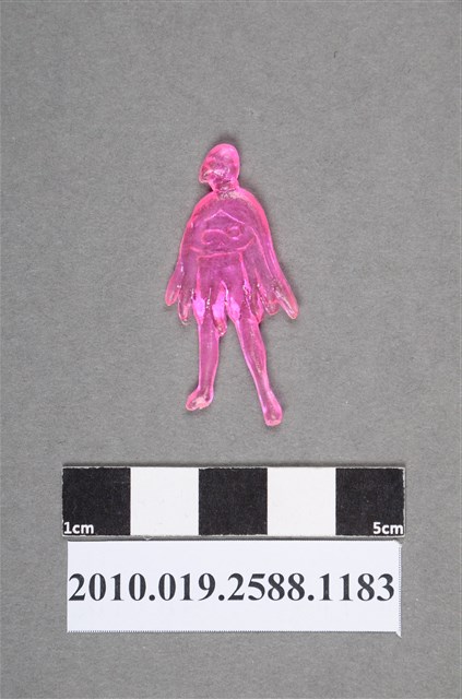1.本物件為卡通科學小飛俠之鐵雄尪仔仙。硬質塑膠材質,扁平,單一桃紅色,雙面浮雕圖案。正面圖案為站立的鐵雄,戴著頭盔,繫有腰帶,身穿鳥羽狀披風,雙手交叉抱胸。