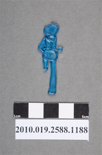 1.本物件為跑步人型尪仔仙。硬質塑膠材質,扁平,單一藍色,雙面浮雕圖案。正面圖案為跑步男性人型,髮型蓬鬆,衣服上有明顯的扣子,雙手彎曲,左腳往後抬,右腳著地。2.尪仔仙尺寸大致可分成小、中、大型,小型約長2-5公分,中型約長8-15公分,顏色以單色為主。有些大型的則可長達30公分左右,以菩薩、神仙和民間傳說故事人物等造型為主,塗上金銀紅黃彩漆等亮色。1960、70年代的尪仔仙多以民間傳說故事、歌仔戲、布袋戲人物為造型。1980年代改以卡通、電玩、漫畫人物造型為主。常見玩法之一為兩人(或多人)各持一只尪仔仙,輪流用手指彈射,看誰的尪仔仙先疊在對方上面,便可贏得對方用來對戰或是約定的尪仔仙。
