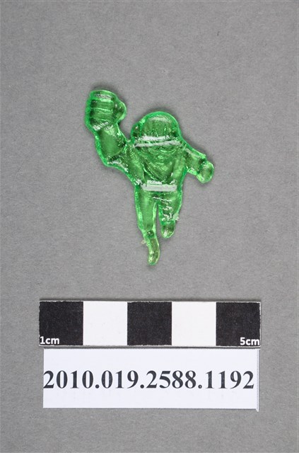 1.本物件為握拳人型尪仔仙。硬質塑膠材質,扁平,單一綠色,雙面浮雕圖案。正面圖案為往前衝的男性形象,其戴有頭盔,左手握拳伸向前,右手握拳往後擺,雙腳呈跑步姿勢。2.尪仔仙尺寸大致可分成小、中、大型,小型約長2-5公分,中型約長8-15公分,顏色以單色為主。有些大型的則可長達30公分左右,以菩薩、神仙和民間傳說故事人物等造型為主,塗上金銀紅黃彩漆等亮色。1960、70年代的尪仔仙多以民間傳說故事、歌仔戲、布袋戲人物為造型。1980年代改以卡通、電玩、漫畫人物造型為主。常見玩法之一為兩人(或多人)各持一只尪仔仙,輪流用手指彈射,看誰的尪仔仙先疊在對方上面,便可贏得對方用來對戰或是約定的尪仔仙。