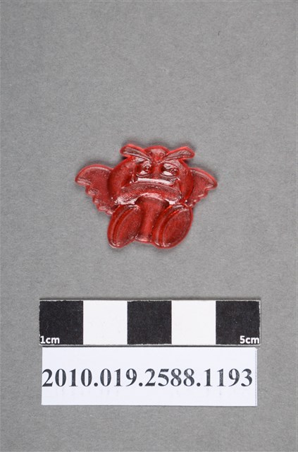 1.本物件為電玩超級瑪利歐兄弟(超級瑪利)之毒蘑菇(毒香菇)尪仔仙。硬質塑膠材質,扁平,單一紅色,雙面浮雕圖案,兩面圖案相同。圖案為擬人化的毒蘑菇,蕈傘表面有眉毛、眼睛、嘴巴、尖牙齒以及類似翅膀的部位,有橢圓形腳,無手。毒蘑菇是超級瑪利歐兄弟電玩系列中經典的敵人之一。