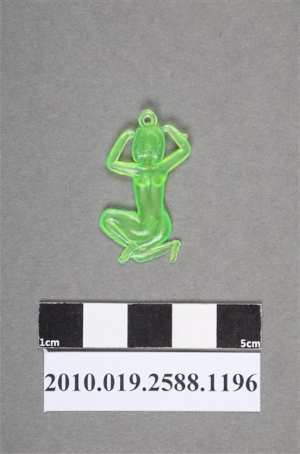 1.本物件為裸體人型尪仔仙。硬質塑膠材質,扁平,單一綠色,雙面浮雕圖案。正面圖案為呈半跪姿的女性,一腳跪著,一腳蹲著,雙手摸頭,可見其胸部形狀。背面圖案可見其屁股形狀,故為裸體人型。頭頂有小吊環。2.尪仔仙尺寸大致可分成小、中、大型,小型約長2-5公分,中型約長8-15公分,顏色以單色為主。有些大型的則可長達30公分左右,以菩薩、神仙和民間傳說故事人物等造型為主,塗上金銀紅黃彩漆等亮色。1960、70年代的尪仔仙多以民間傳說故事、歌仔戲、布袋戲人物為造型。1980年代改以卡通、電玩、漫畫人物造型為主。常見玩法之一為兩人(或多人)各持一只尪仔仙,輪流用手指彈射,看誰的尪仔仙先疊在對方上面,便可贏得對方用來對戰或是約定的尪仔仙。