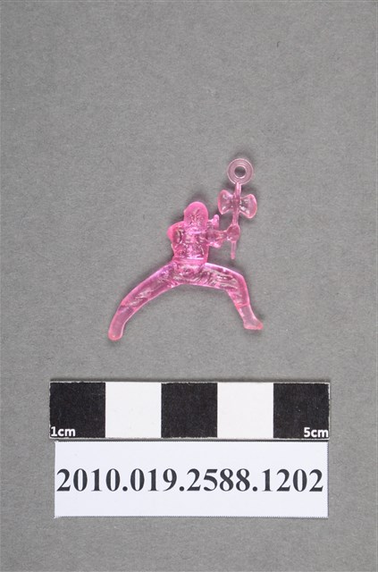 1.本物件為持斧人型尪仔仙。硬質塑膠材質,扁平,單一粉紅色,雙面浮雕圖案。正面圖案為右手持著雙頭斧的站立男性人型,光頭和有絡腮鬍,雙腳往左右張開,膝蓋略有彎曲。雙頭斧柄頂上有小吊環。2.尪仔仙尺寸大致可分成小、中、大型,小型約長2-5公分,中型約長8-15公分,顏色以單色為主。有些大型的則可長達30公分左右,以菩薩、神仙和民間傳說故事人物等造型為主,塗上金銀紅黃彩漆等亮色。1960、70年代的尪仔仙多以民間傳說故事、歌仔戲、布袋戲人物為造型。1980年代改以卡通、電玩、漫畫人物造型為主。常見玩法之一為兩人(或多人)各持一只尪仔仙,輪流用手指彈射,看誰的尪仔仙先疊在對方上面,便可贏得對方用來對戰或是約定的尪仔仙。