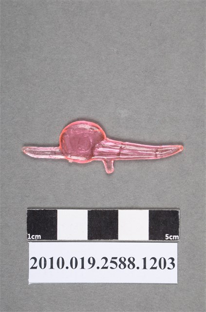 1.本物件為粉紅色尪仔仙。硬質塑膠材質,扁平,單一粉紅色,雙面浮雕圖案。無法辨識圖案類型,由圓形和2個尖狀構件組合而成主體,較大的尖狀下方有凸出物。2.尪仔仙尺寸大致可分成小、中、大型,小型約長2-5公分,中型約長8-15公分,顏色以單色為主。有些大型的則可長達30公分左右,以菩薩、神仙和民間傳說故事人物等造型為主,塗上金銀紅黃彩漆等亮色。1960、70年代的尪仔仙多以民間傳說故事、歌仔戲、布袋戲人物為造型。1980年代改以卡通、電玩、漫畫人物造型為主。常見玩法之一為兩人(或多人)各持一只尪仔仙,輪流用手指彈射,看誰的尪仔仙先疊在對方上面,便可贏得對方用來對戰或是約定的尪仔仙。