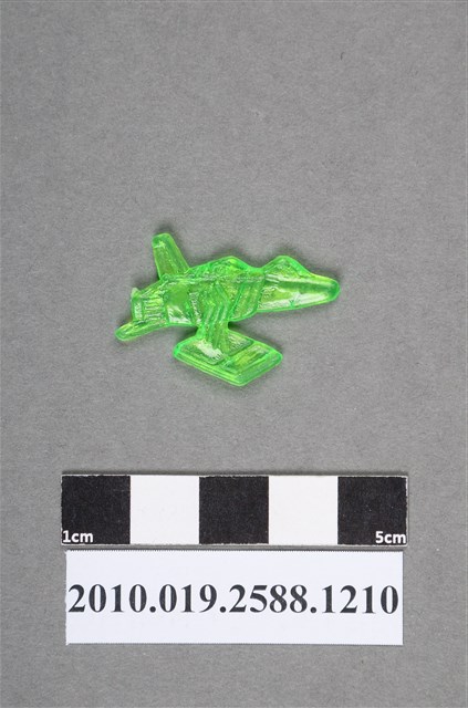 1.本物件為綠色尪仔仙。硬質塑膠材質,扁平,單一綠色,雙面浮雕圖案,兩面圖案相同。難以判斷圖案為何,似飛行器,有類似尾翼的地方。2.尪仔仙尺寸大致可分成小、中、大型,小型約長2-5公分,中型約長8-15公分,顏色以單色為主。有些大型的則可長達30公分左右,以菩薩、神仙和民間傳說故事人物等造型為主,塗上金銀紅黃彩漆等亮色。1960、70年代的尪仔仙多以民間傳說故事、歌仔戲、布袋戲人物為造型。1980年代改以卡通、電玩、漫畫人物造型為主。常見玩法之一為兩人(或多人)各持一只尪仔仙,輪流用手指彈射,看誰的尪仔仙先疊在對方上面,便可贏得對方用來對戰或是約定的尪仔仙。