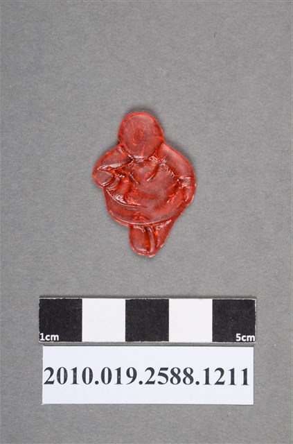 1.本物件為紅色人型尪仔仙。硬質塑膠材質,扁平,單一紅色,雙面浮雕圖案。圖案為呈走路姿勢的矮胖男性,留有鬍子,穿著西裝,左手放在腰間,右手放在身後。2.尪仔仙尺寸大致可分成小、中、大型,小型約長2-5公分,中型約長8-15公分,顏色以單色為主。有些大型的則可長達30公分左右,以菩薩、神仙和民間傳說故事人物等造型為主,塗上金銀紅黃彩漆等亮色。1960、70年代的尪仔仙多以民間傳說故事、歌仔戲、布袋戲人物為造型。1980年代改以卡通、電玩、漫畫人物造型為主。常見玩法之一為兩人(或多人)各持一只尪仔仙,輪流用手指彈射,看誰的尪仔仙先疊在對方上面,便可贏得對方用來對戰或是約定的尪仔仙。