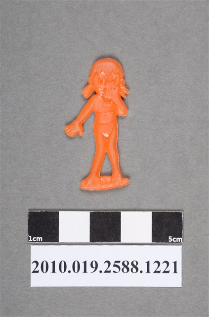 1.本物件為卡通哆啦A夢(小叮噹)之靜香尪仔仙。硬質塑膠材質,扁平,單一不透明橘色,雙面浮雕圖案,兩面圖案相同。圖案為綁著2個馬尾的靜香站立,眼睛睜大,身穿內衣內褲,一手摀住嘴巴,一手向旁邊伸,呈驚訝貌。