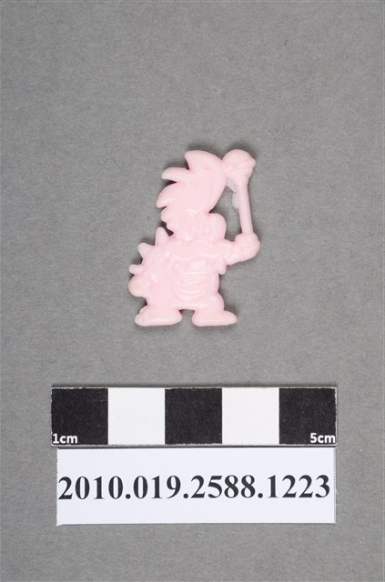 1.本物件為電玩超級瑪利歐兄弟(超級瑪利)之庫巴尪仔仙。硬質塑膠材質,扁平,單一不透明粉紅色,雙面浮雕圖案,兩面圖案相同。庫巴頭上有明顯立起來的髮型,嘴巴可見獠牙露出,有背殼,殼上有刺,一手舉著棒子,一手垂下。庫巴是超級瑪利歐兄弟電玩系列中的大魔王。